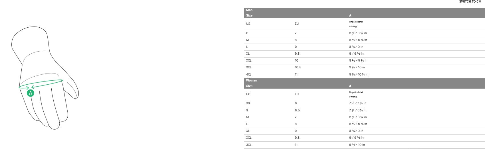 | Eingesetzte Materialien | Gelochtes Rindleder in 0,8/0,9 mm Stärke; Keramide Einsätze für hohen Schutz gegen Abrieb; Carboneinsätze; Superfabric® Super reiß-, schnitt- und stich- fester Stoff; Hochresistente Velour Mikrofaser; schoeller Keprotec Einsätze für hohen Schutz gegen Abrieb; Stretchgewebe/dehnbar; Warrior-Schutz auf den äußeren Seiten der Hand |