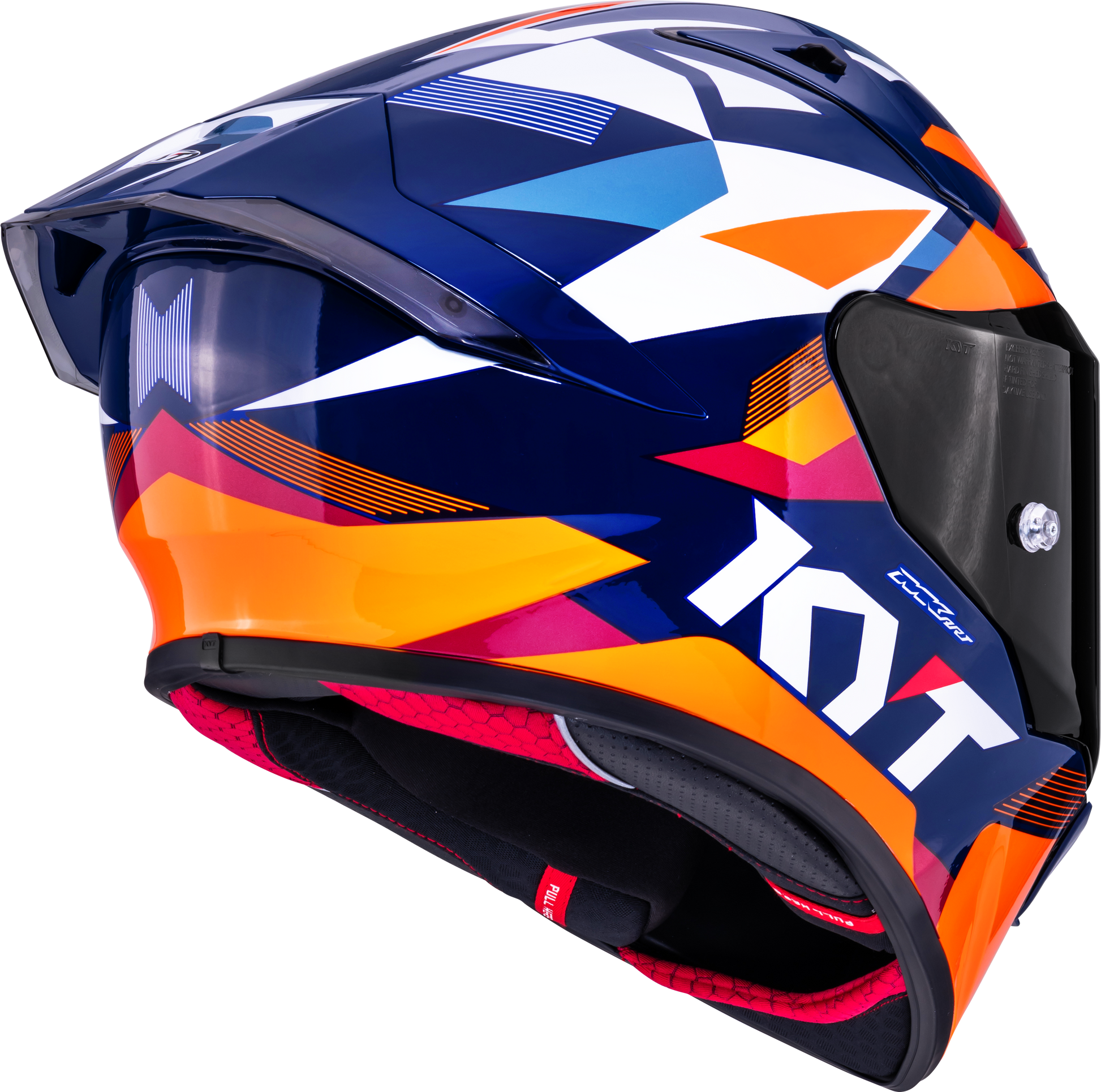 El KYT R1R Carbon Diamond Azul/Naranja combina un rendimiento de carreras intransigente con un diseño de diamante distintivo y elegante. La combinación de la estructura de carbono brillante y los acentos de color azul-naranja dinámicos hace de este casco una verdadera declaración premium – moderno, agresivo y absolutamente deportivo.