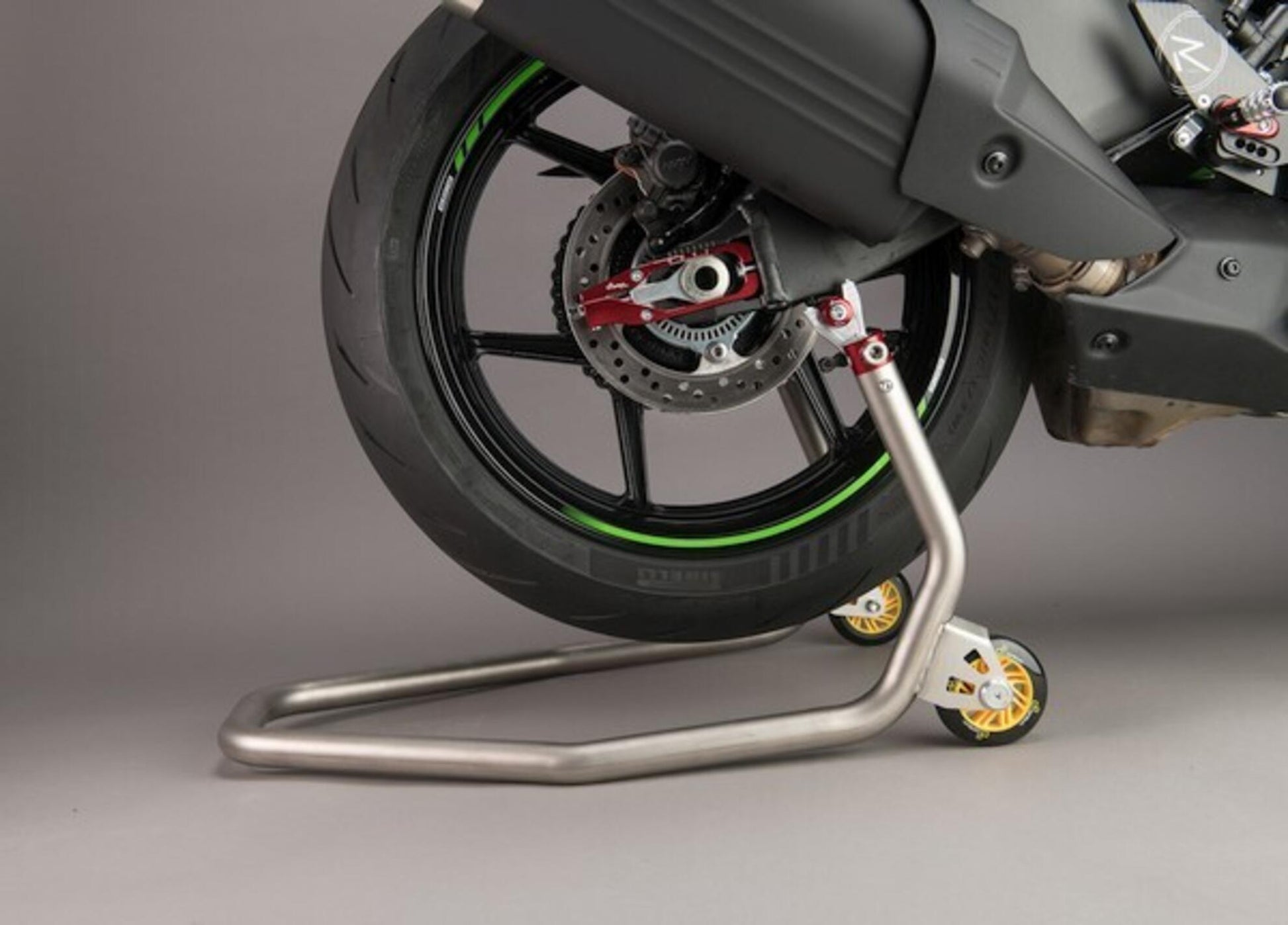 El soporte trasero de acero inoxidable combina utilidad práctica, estabilidad y un diseño elegante – una herramienta indispensable para el garaje y el pit lane.